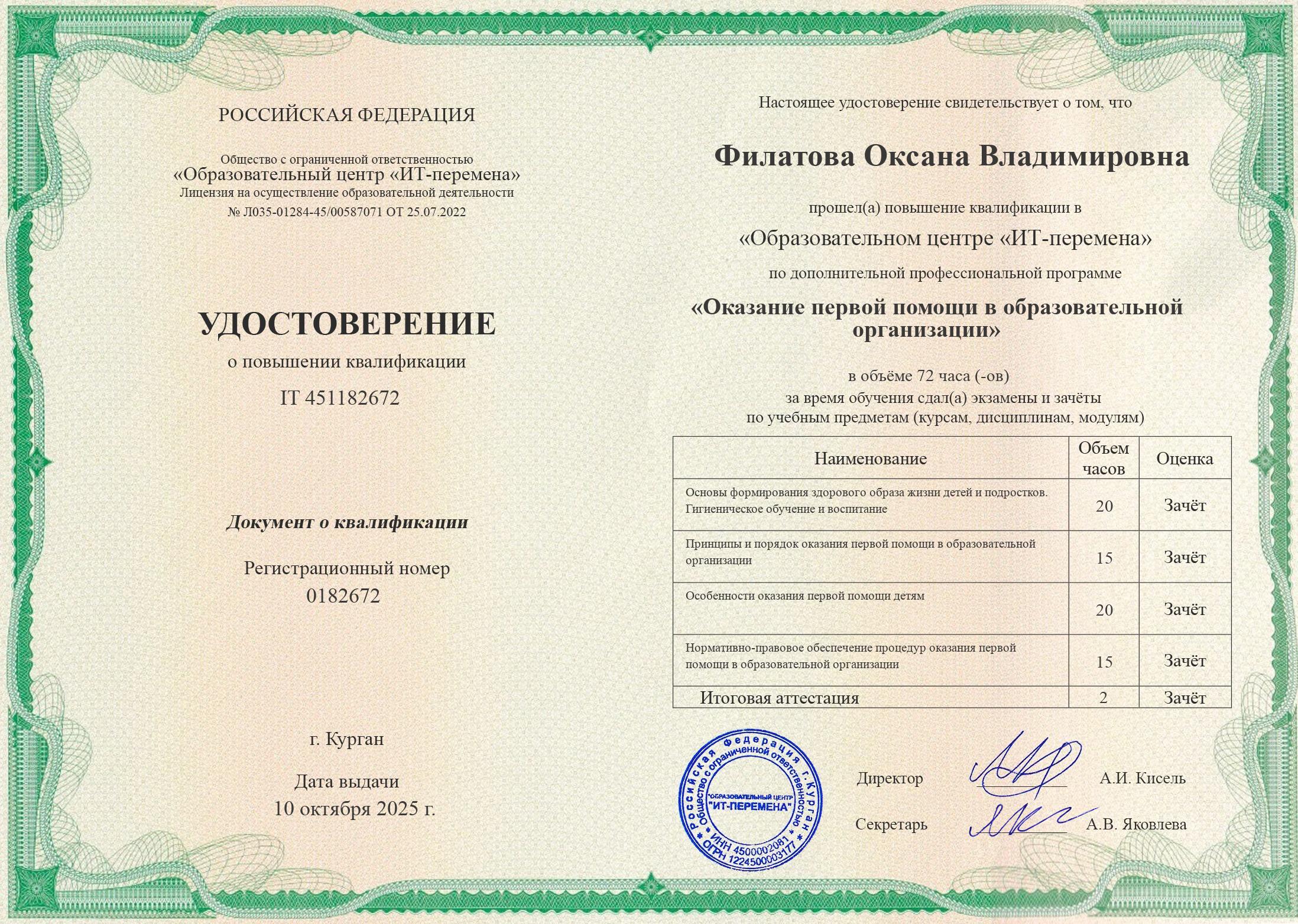 удостоверение повышения квалификации "Оказание первой помощи в образовательной организации"